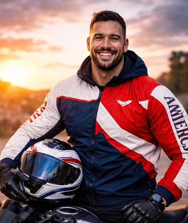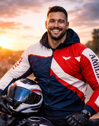 Realistic portrait of a satisfied motorcyclist smiling with helmet in hand, urban background.